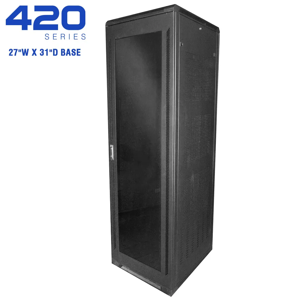 Quest 420 Series Floor Enclosures have a 27″ width by a 31″ depth, featuring a reversible smoked acrylic front door, and rear vented split doors. The rack has a spacious interior from the outer panels, making it ideal for 19” wide mounting on front and rear adjustable rails. They come complete with casters, floor levelers, a grounding bus, as well as two 80 CFM boxer fans for ventilation and air flow. These cabinets are constructed of heavy-duty steel, coming in a black powdercoat microfinish. Available assembled or non-assembled in knockdown boxes.