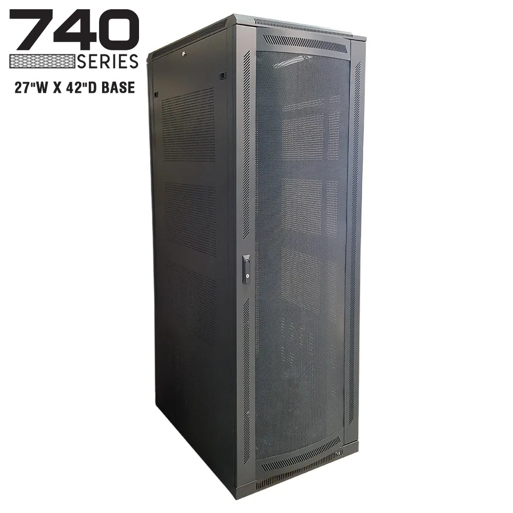Quest’s largest enclosures, the 740 Series Floor Enclosures, have a 27″ width by 42″ depth. The series features a reversible vented steel mesh front door, and rear vented split doors for access and ventilation. The rack has a large spacious interior from the outer panels, making it ideal for 19” wide mounting on front and rear adjustable rails. They come complete with casters, floor levelers, a grounding bus, as well as two 80 CFM boxer fans for ventilation and air flow. These cabinets are constructed of heavy-duty steel, coming in a black powdercoat microfinish. Available assembled or non-assembled in knockdown boxes.