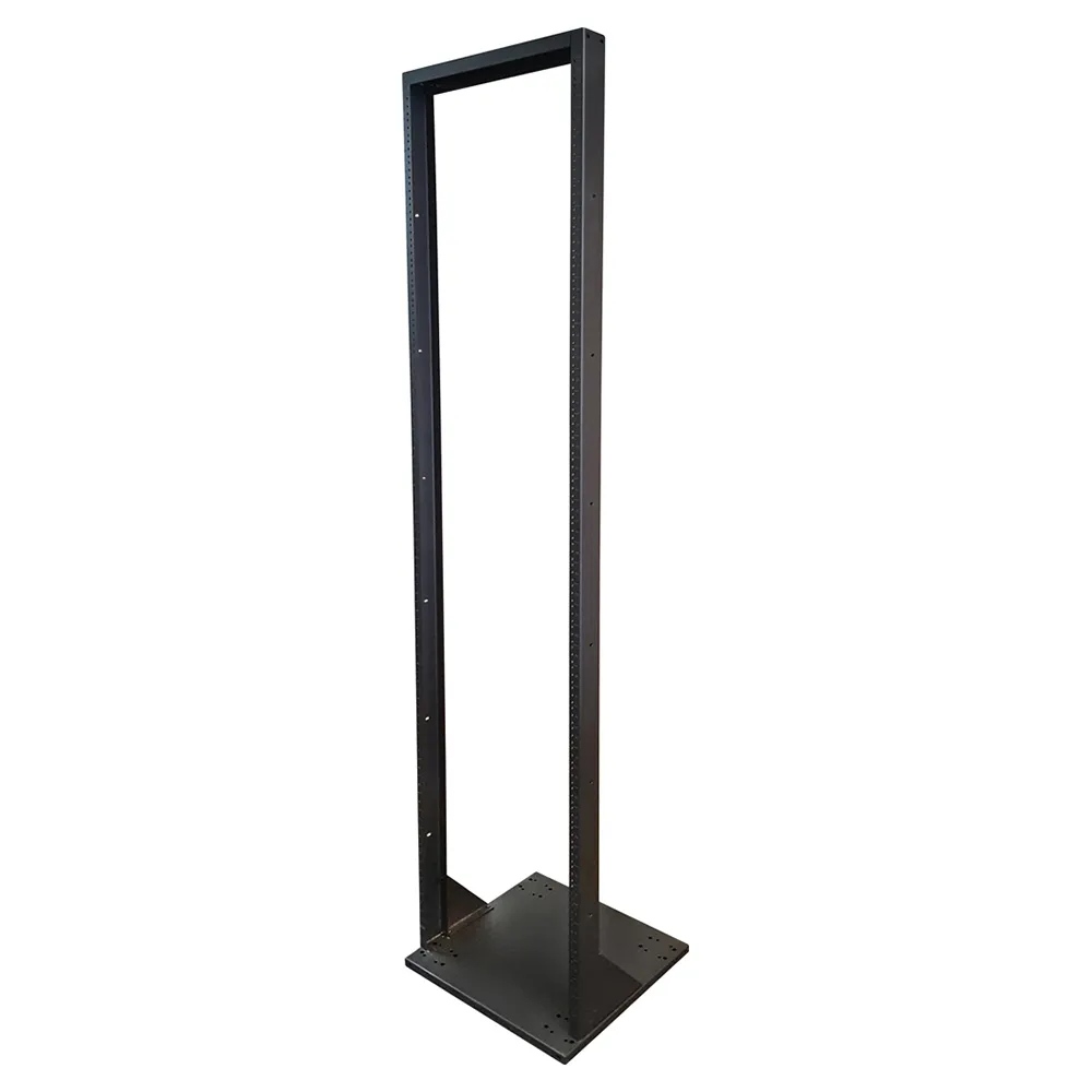 This Floor Mount Rack is an economy 2-post open frame rack that has the capability to be configured into a 4-post rack with the optional expansion kit (FR1907-45-02LE). These racks are constructed of steel and are built with a tapped hole rail design. They are ideal for mounting of patch panels, hubs, routers, Audio/Video equipment and more. They have a black microfinish with numbered rack units, and come in a 7ft. height.