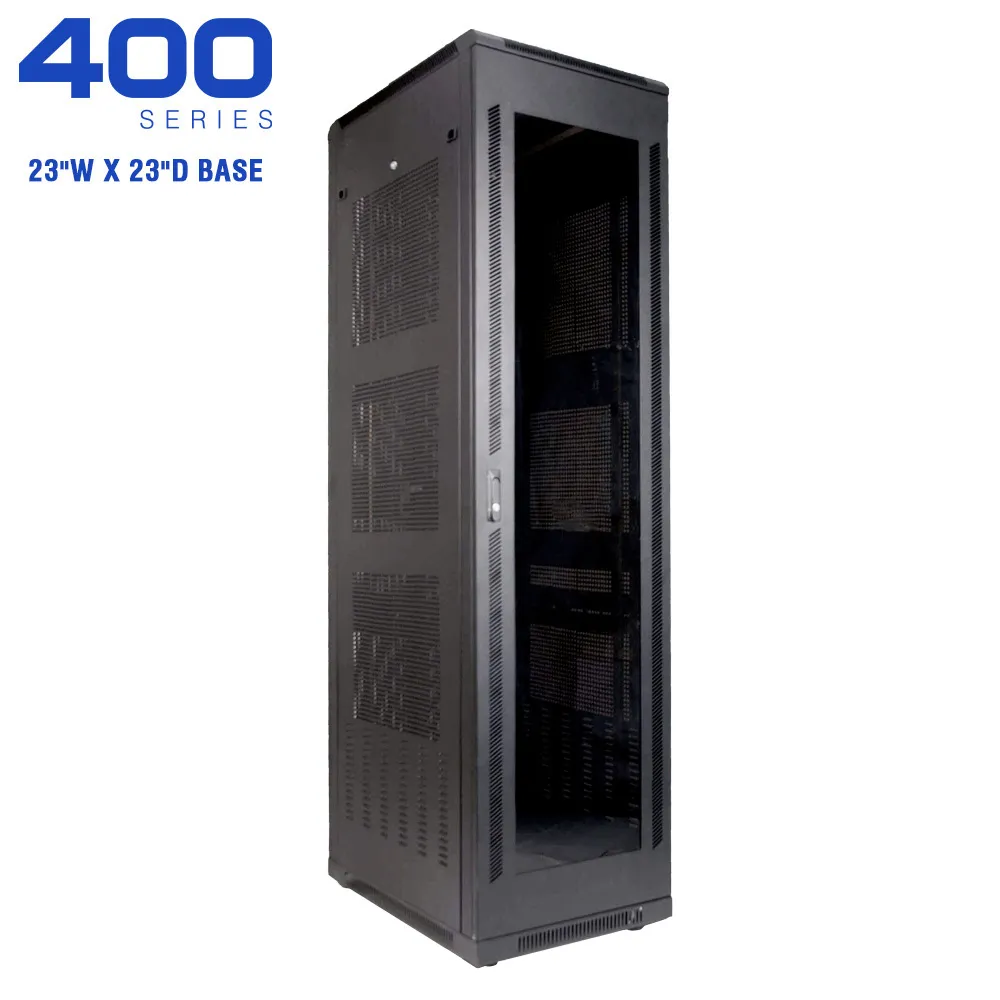 Quest 400 Series Floor Enclosures have a 23″ width by a 23″ depth, featuring a reversible smoked acrylic front door, and rear vented split doors. Ideal for 19” wide mounting on front and rear rails. They come complete with casters, floor levelers, a grounding bus, as well as two 80 CFM boxer fans for ventilation and air flow. These cabinets are constructed of heavy-duty steel, coming in a black powdercoat microfinish. Available assembled or non-assembled in knockdown boxes.
